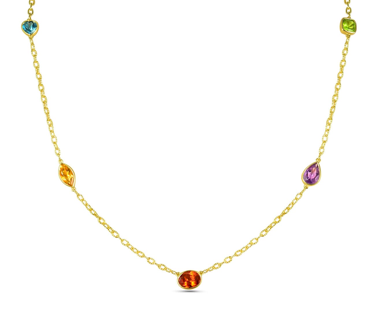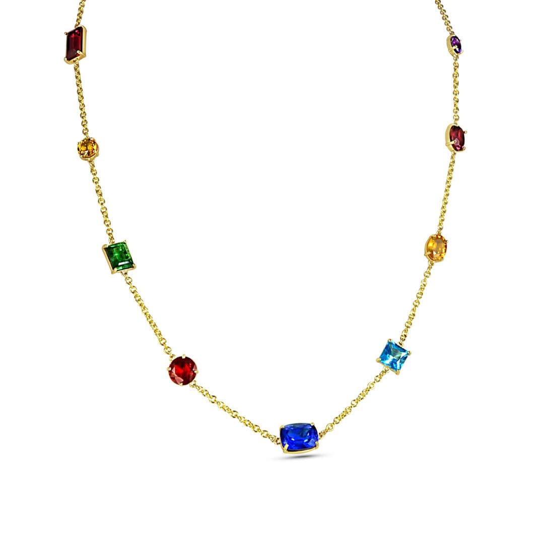 14kt yellow gold station necklace features prong-set gemstones of mixed shapes and colors.