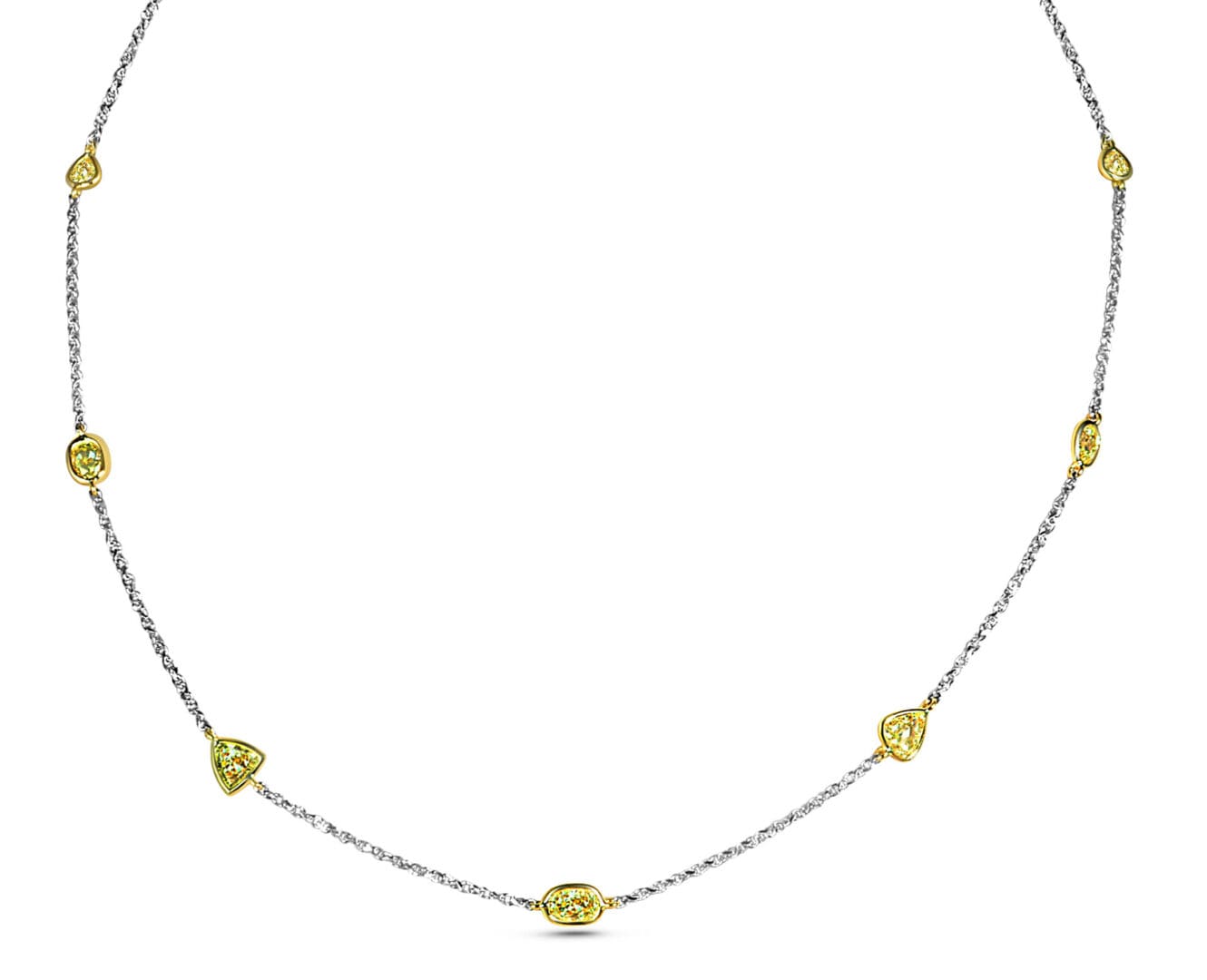 18kt white gold chain with 18kt yellow gold bezels features mixed shapes of fancy yellow diamonds, totaling 2.00 cts.
