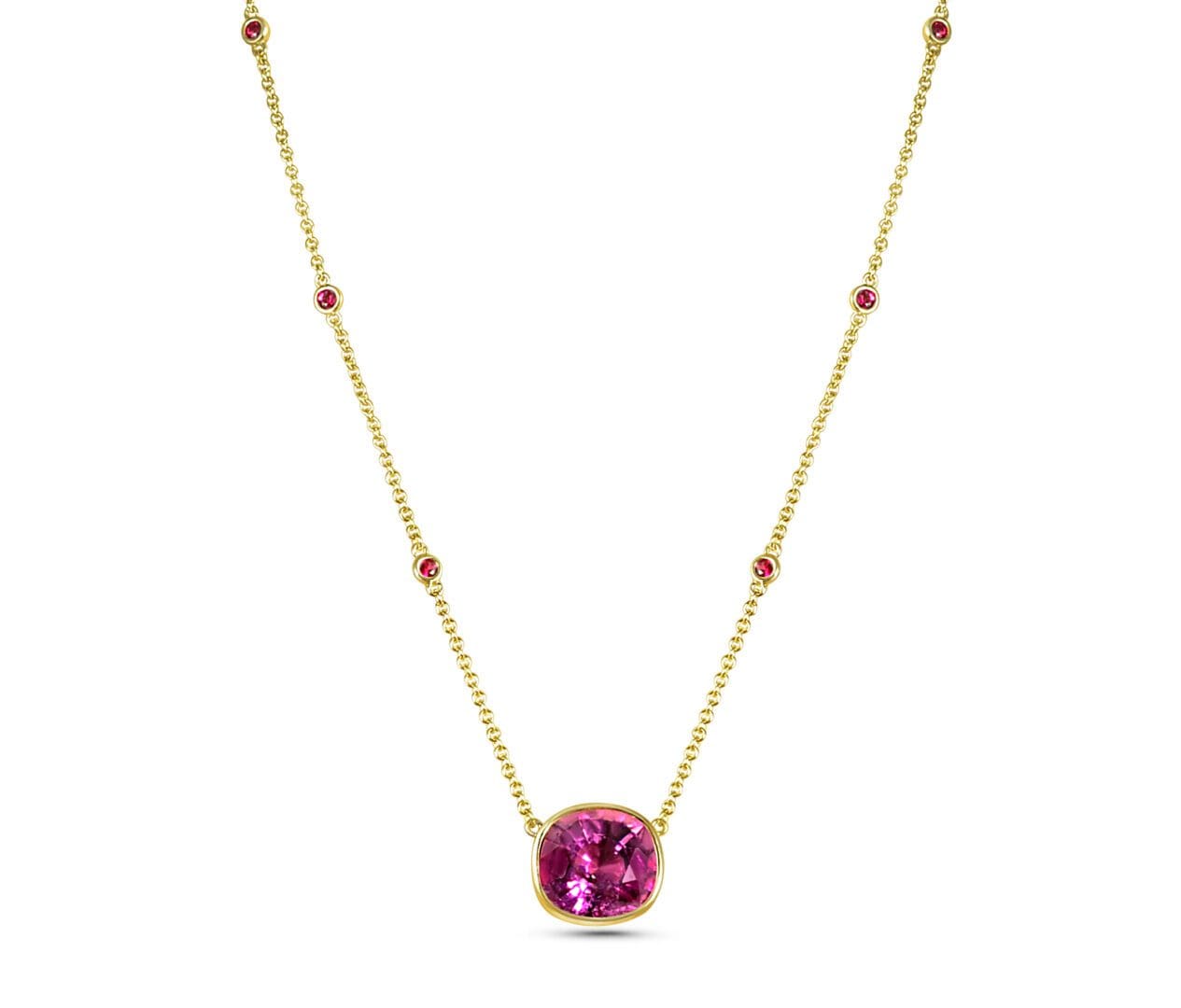 14kt yellow gold necklace with rubies and 6.88 ct. tourmaline center.