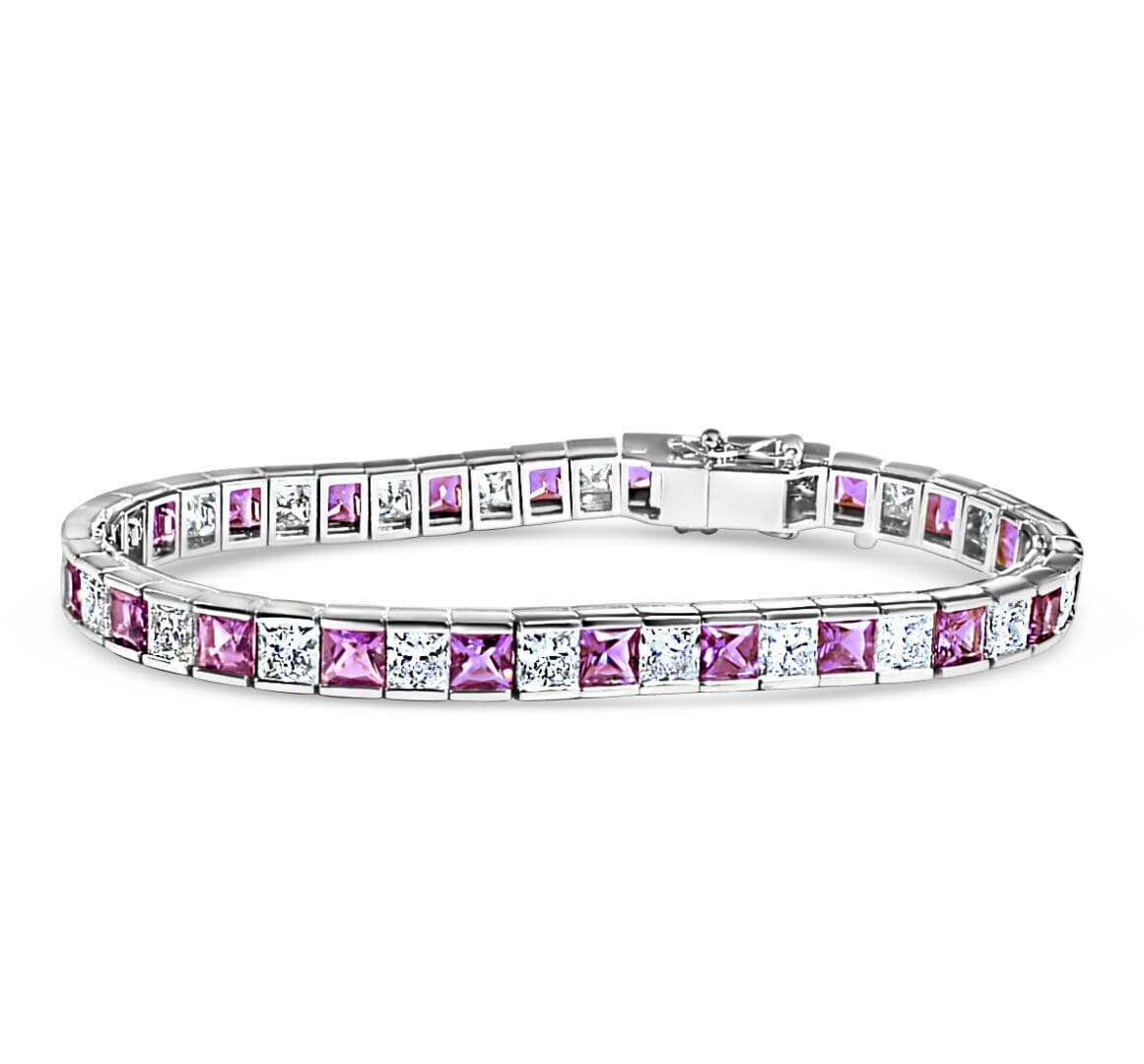 14kt white gold tennis style bracelet with 8.86 cts. of lab princess cut diamonds and 3.50 cts. of princess cut amethyst.